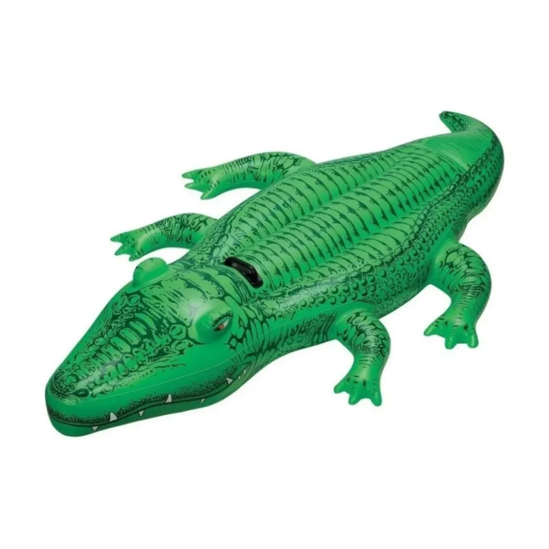 Flotador Inflable Diseño de Cocodrilo verde. Lleva un poco de colorido, realista y amigable diversión de caimanes a tu próxima piscina o lago con este delicioso inflable de Intex.nnEl cocodrilo verde brillante está hecho de vinilo resistente a los rayos UV y tiene espacio para varios niños de todas las edades.nnCaracterísticas espacio para múltiples pasajeros Construida de vinilo durable de calibre 10. Dos cámaras de aire.nnIncluye kit de parche de reparación.nnMide 1.6886 cm.