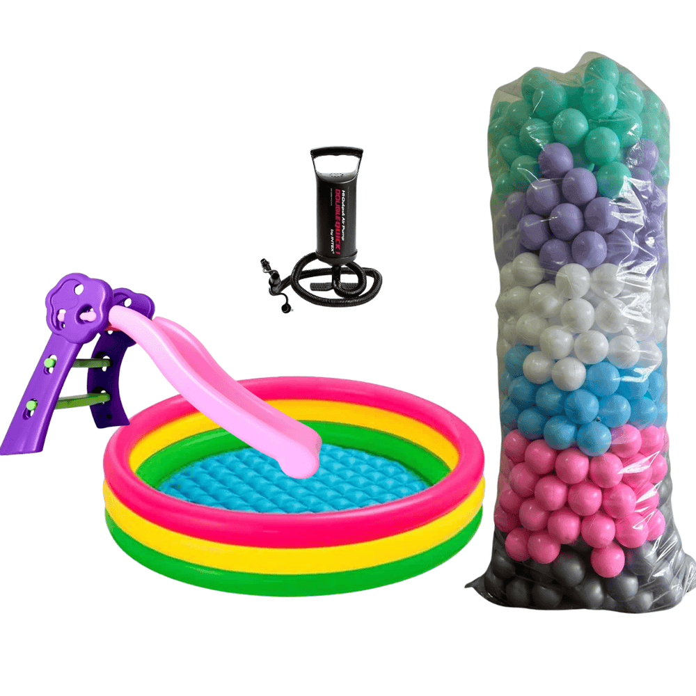 ¿Por qué elegir este combo? Porque no tienes que buscar cada accesorio por separado. La piscina, las pelotas, la bomba y el deslizadero llegan juntos a tu puerta. Ideal para cumpleaños, vacaciones o regalo. Los materiales son resistentes y seguros para niños. Las pelotas no tienen filo y son de tamaño seguro. La piscina es fácil de inflar y desinflar para guardar.