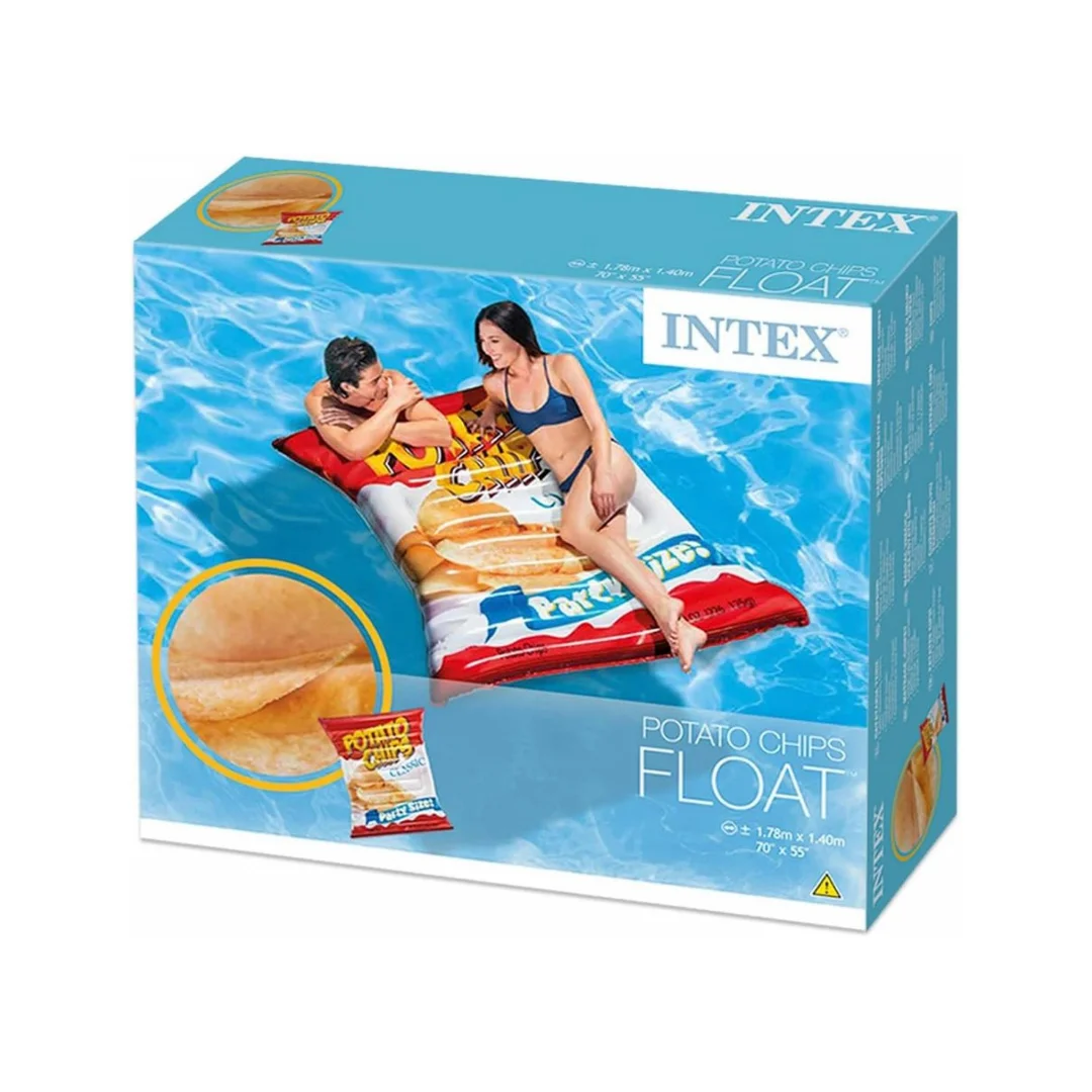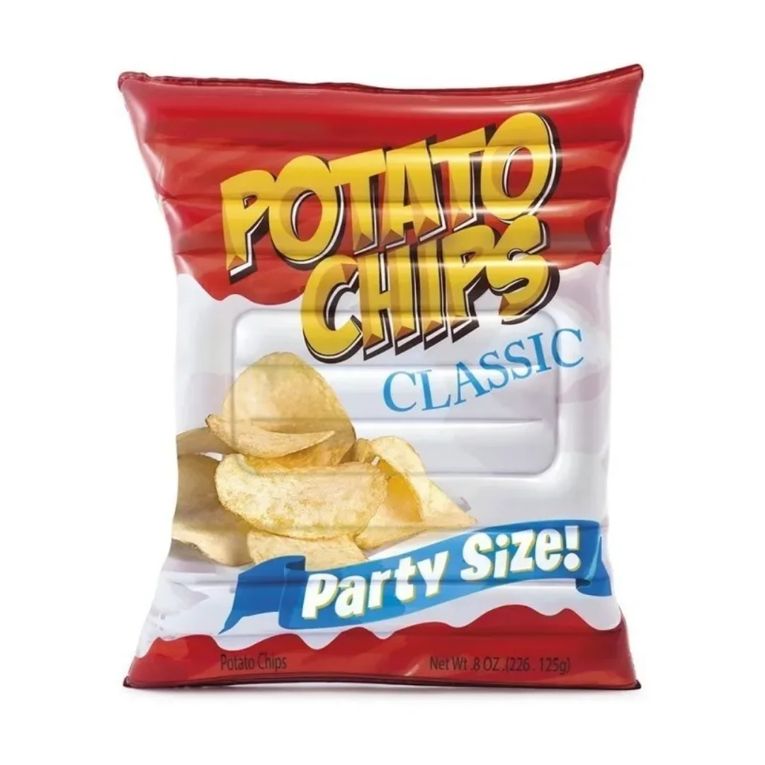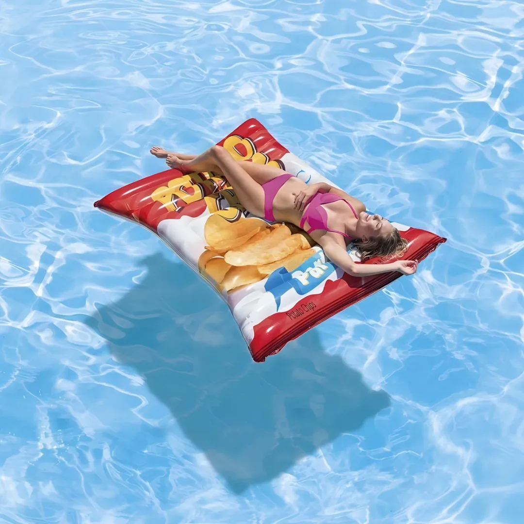 Flotador en forma de paquete de papas, adecuado tanto para niños como para adultos para pasar momentos relajantes.
