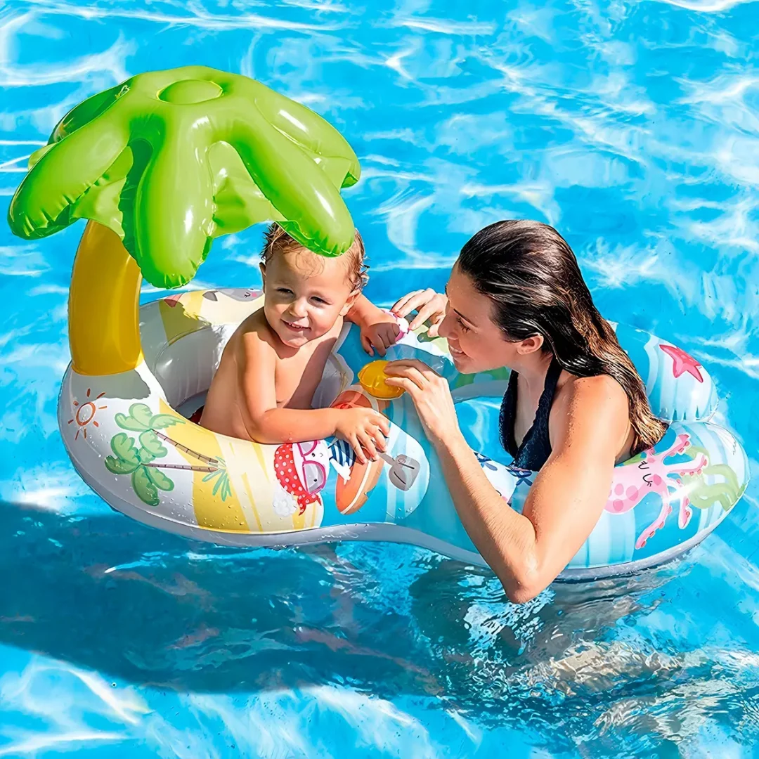 Espectacular flotador para bebé y adulto, este salvavidas tiene una palmera que permite proteger al bebé del sol diseñado para la diversión y seguridad de tus hijos. Los flotadores aparte de brindar seguridad, también estimulan la motricidad de los bebés.