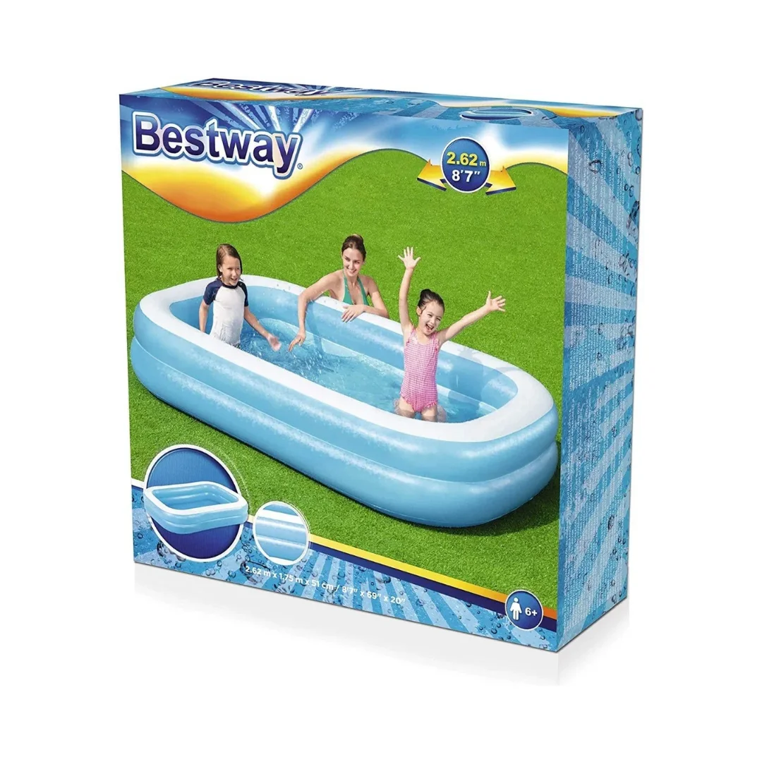 Piscina inflable con forma rectangular, está fabricada de vinilo resistente en color transparente y azul.