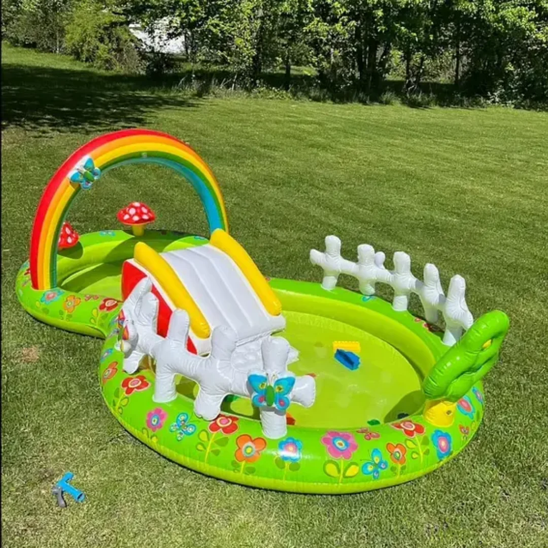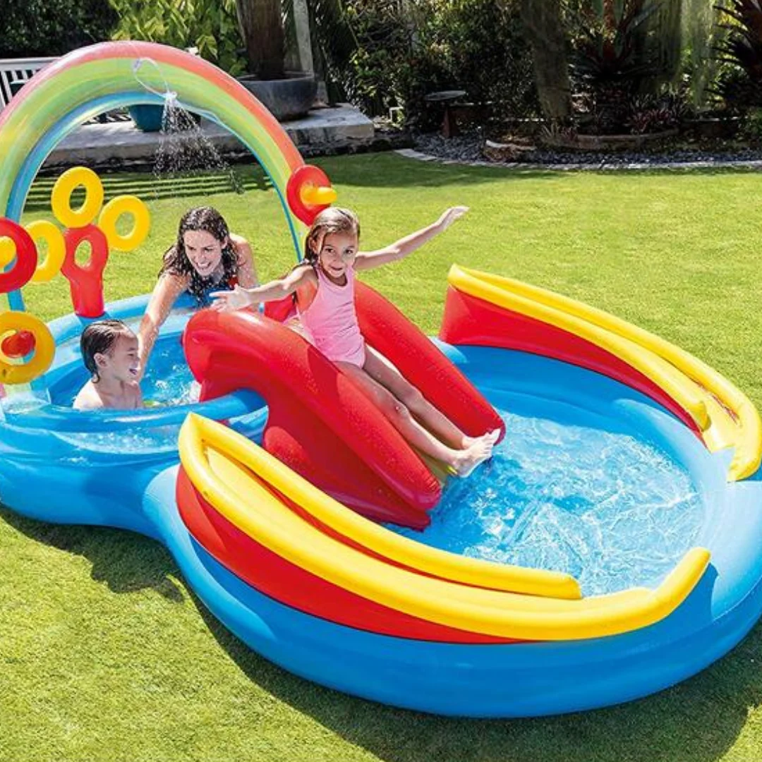 La piscina incluye los siguientes juguetes: tobogán, ducha refrescante situada encima del arco iris, juego de anillas (4 anillas hinchables incluidas) y dos pequeños toboganes para las pelotas en los lados de la piscina. Conectando el tubo del agua al arco iris se puede crear una maravillosa ducha refrescante. Colchón de aterrizaje situado al final del tobogán.