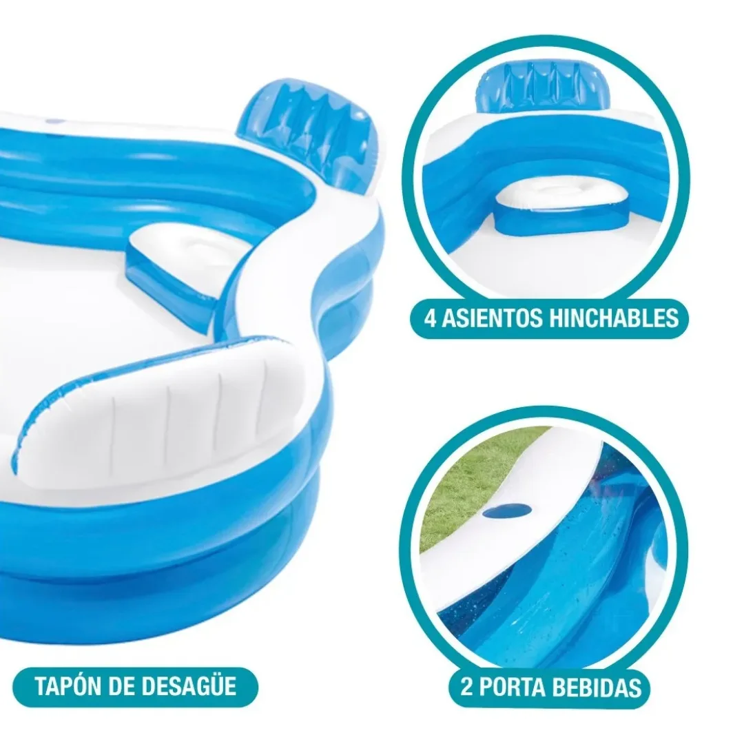 Incluye 4 sillas con respaldos hinchables, 2 portavasos, tapón de drenaje y kit de parches para reparaciones.